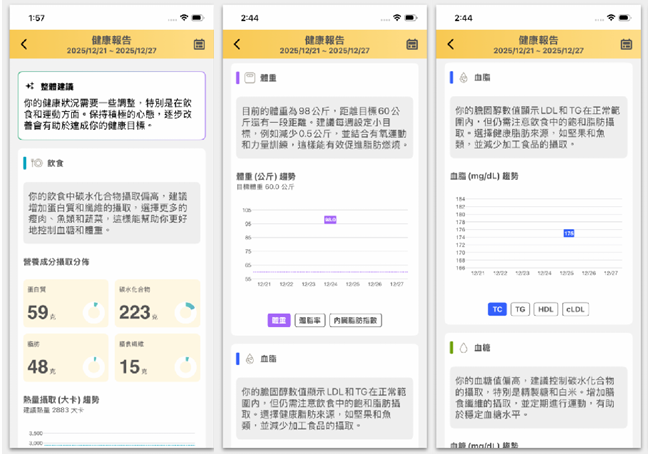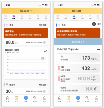 Premium 版本提供 AI 營養師週報,將零散的飲食與生理數據彙整成專業報告。針對追求精準管理的用戶,我們提供個人化生理指標判讀(包含血脂、血糖、血壓、體重),讓您即時掌握數據是否達標。此外,專業的互動預警系統會在進度落後或指標異常時發出提醒,並支援跨帳號即時共享,讓家屬或醫護人員能同步照護。